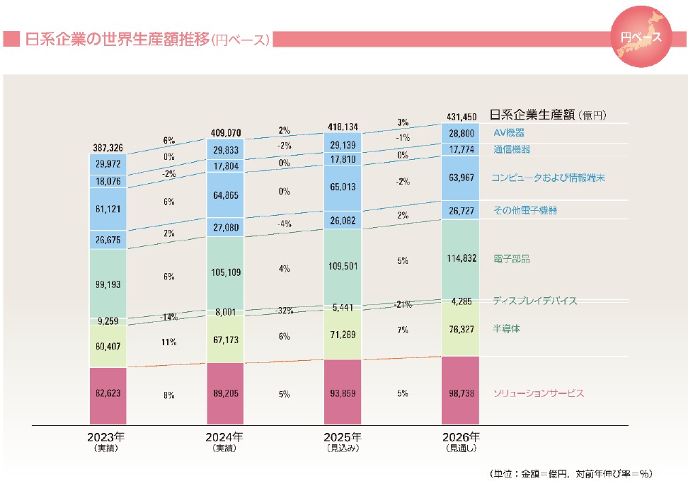 2025年の海外生産分を含む日系企業の世界生産額は、前年比2%増となる41兆8134億円が見込まれている。Windows 10サポート終了に伴うパソコンの買替需要が堅調で、生成AIの普及を背景にした半導体や電子部品、ソリューションサービス需要も全体を下支えした。2026年は、デジタル化投資の加速によりソリューションサービスが着実に成長、電子部品・デバイスも堅調に推移する見込みであることから、前年比3%増の43兆1450億円となる見通し。