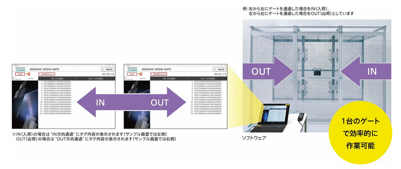 右から左にゲートを通過した場合をIN(入荷)、左から右にゲートを通過した場合をOUT(出荷)とし、1台のゲートで入荷/出荷作業が可能になるため、作業性が向上