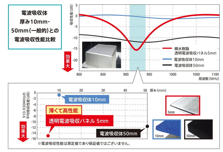 同社は交通景観資材メーカーとして、2000年代初頭よりETC電波吸収体の開発・生産・販売に取り組んでおり、そこで培った電波吸収体の技術をもとに、東京都市大学との連携のもとで研究を重ねてきた。その成果として、透明でありながら、一般的な電波吸収体より高い電波吸収性能を備えた透明電波吸収パネルを開発した。