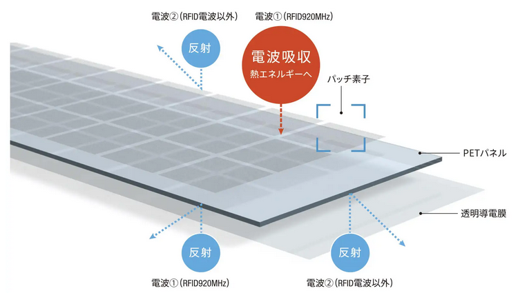 しかしその一方で、電波の反射により通信が乱れたり、タグが誤認識されたりするなどの課題があった。これまでも電波吸収パネルによる対策は存在していたが、その多くは不透明な素材であったため、作業者の視界を妨ぐ、監視カメラの死角を生むといった新たな課題を引き起こしていた。
