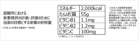 ・避難所における栄養の参照量(詳細下表)として示されているビタミンB1, B2, Cが1日の1/3以上含まれている。