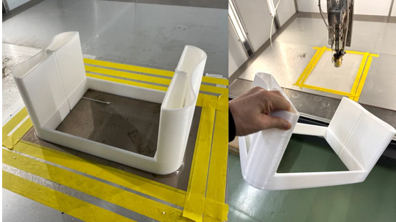 同製品により、従来の一筆書きに限定された造形方式から脱却し、間欠吐出による柔軟なパス制御が可能に。これにより、複雑形状や開口部を含む造形物の品質が向上し、大型造形の設計自由度が飛躍的に拡大する。