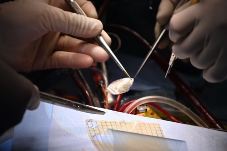 心・血管修復パッチ「シンフォリウム」は、先天性心疾患の手術で使用される医療機器。吸収性の糸と非吸収性の糸で編んだ特殊な構造のニットに、吸収性の架橋ゼラチン膜を一体化させている。手術によって心臓や血管に縫着された後に、まず架橋ゼラチン膜が、次に吸収性の糸が徐々に分解されながら、非吸収性の糸を含むように自己の組織が形成されることで、先天性心疾患の外科手術後に生じる材料の劣化や、身体の成長に伴うサイズのミスマッチといった課題の解決が期待されている。