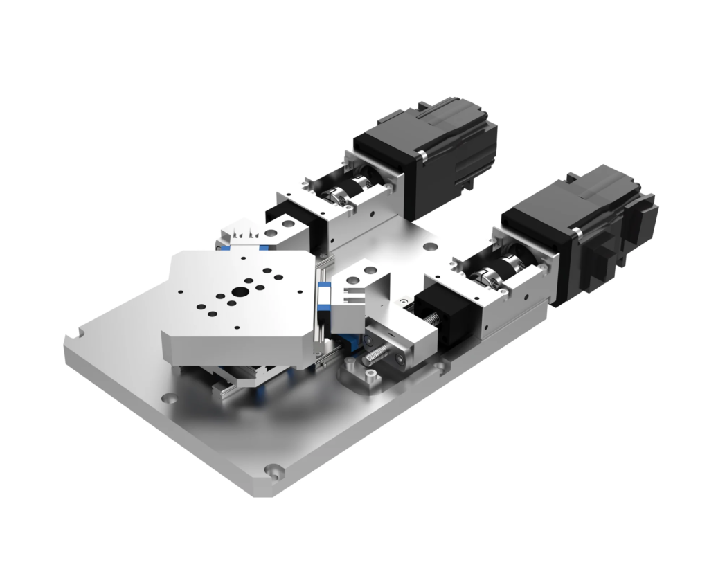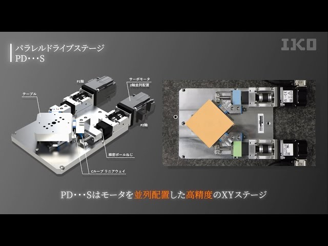 『パラレルドライブステージ PD…S』は、2軸並列に配置したボールねじアクチュエータの直線運動をXY運動に変換する構造を備えることで低断面化を実現した精密位置決めXYステージ。直線案内部にはメンテナンスフリーシリーズのCルーブリニアウェイを採用することで、コンパクトで耐久性にも優れている。