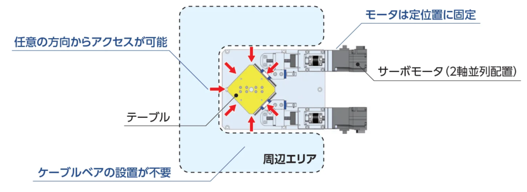 ・モータを一方向のみに配置しているため、配置側を除いた任意方向から容易に作業可能