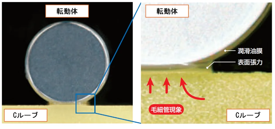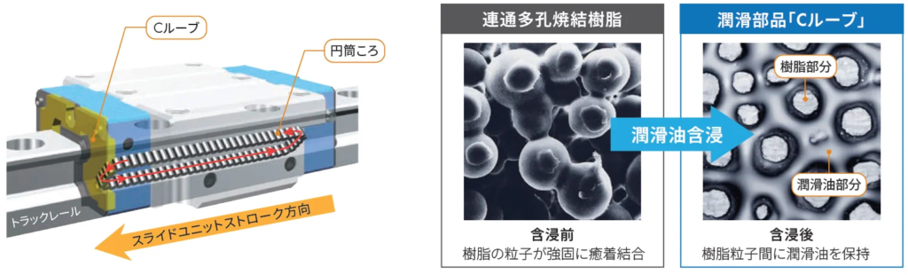 ・Cルーブは、多孔質の焼結樹脂に潤滑油を含侵させた潤滑部品。Cルーブと転動体が接触すると、毛細管現象により必要最小限の潤滑油が転動体の表面に直接供給される。これによって、長期間のメンテナンスフリーによる経済性と潤滑油の消費量抑制(オイルミニマム効果)による環境負荷低減の両面を同時に実現
