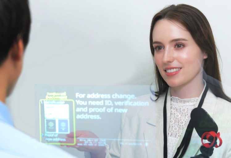 音声をリアルタイムで認識し、字幕だけでなく会話に合わせた図や動画も表示する。透明なアクリル板に発話内容を表示することで、会話中でも表情を確認しながら自然な対話が可能になる。高齢者や難聴者とのコミュニケーション、また行政・医療の現場など複雑な情報の正確な伝達が求められる場面で有用。