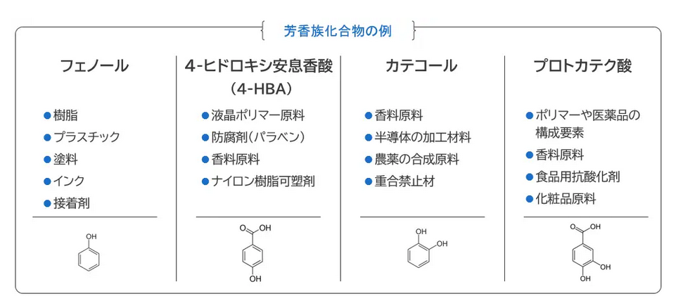 芳香族化合物は、プラスチックや樹脂、医薬品、香料、染料など、私たちの身の回りで幅広く利用される重要な原料。現在、その多くは石油化学プロセスによって生産されているが、CO₂排出による環境負荷や、原油価格の変動、地政学的リスクの影響を受けやすいという課題を抱えている。近年、カーボンニュートラルの実現に向けて、化石資源に依存しない持続可能な生産方法の確立が求められている。
