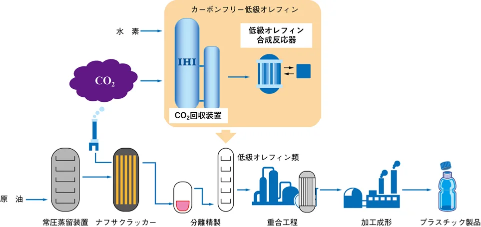 同プラントで製造される低級オレフィンは、SCGC内で稼働中のナフサクラッカー※2から排気ガスの供給を受け、そのガスから分離回収したCO2とSCGC内の他工程から発生する副生水素を利用し、IHIが開発したCO2変換触媒※3を用いて合成されるもの。ナフサクラッカーから排出されるCO2をそのまま原料として用いる世界初のパイロットプラントとなる。
