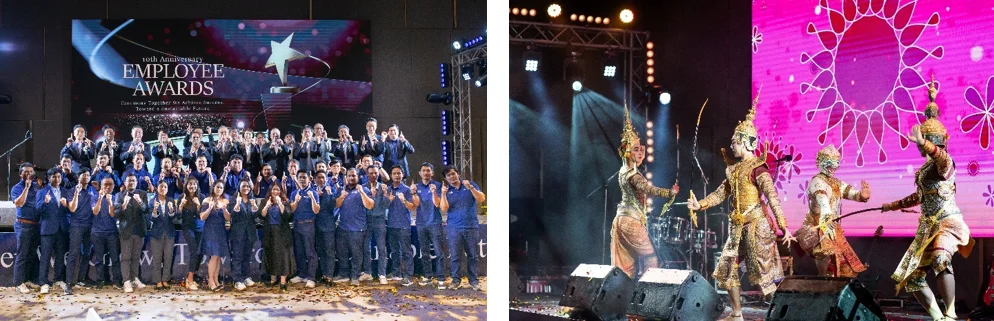祝賀パーティ冒頭では勤続10年の従業員表彰も行われ、タイ伝統のパフォーマンスが披露される盛大なイベントとなった。OB・OGも参加し、従業員が再会を喜ぶ姿も見られ、明るく風通しの良い社風を感じられるひと時を過ごした。