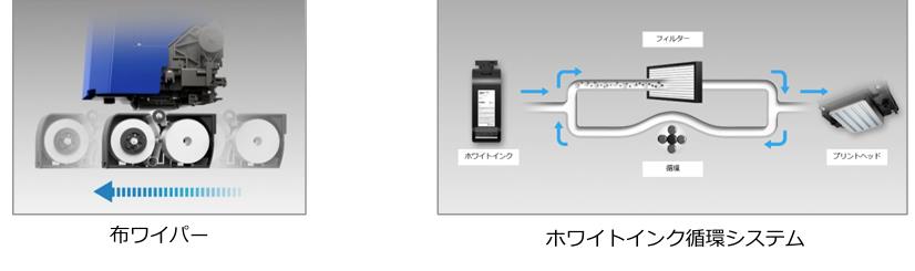 自動メンテナンス機能が充実しているため、DTF専用プリンターで必要であった毎日のメンテナンス作業が不要。プリントヘッドを清潔に保つために必要な「吸引キャップ」には自動クリーニング機能を搭載。またロール式の布製ワイパーを搭載し、常に新しい布でプリントヘッドを拭きとるため、毎日の部品清掃が不要となる。さらに、ホワイトインクの自動循環システムでインク詰まりを防ぐなど、充実した自動メンテナンス機能により、メンテナンス工数を大幅削減しながら安定稼働を実現する。