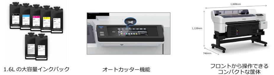 使いやすさを考慮し、インク交換回数を抑える1.6Lの大容量インクパックや、パネルで操作する便利なオートカッター機能を搭載。また、コンパクトな筐体に加え、前面給紙・排紙のフロントオペレーションでプリンターの背面にスペースをとる必要がないため、作業スペースを広く確保することができる。