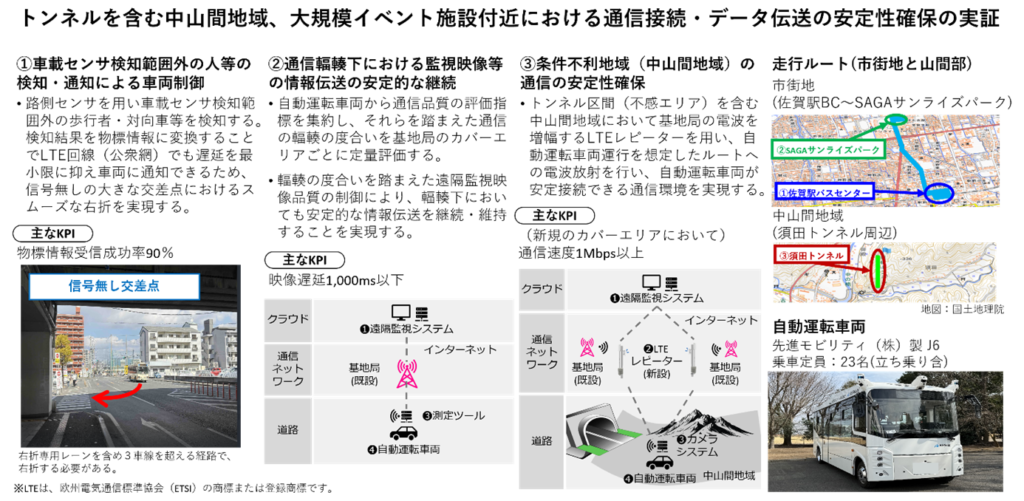 深刻なバス運転手不足の対策の1つとして、自動運転バスのレベル4導入への期待が高まっている。2023年4月の道路交通法改正により、日本でも特定地域での自動運転レベル4が解禁された。今回の実証では、佐賀市にて、混雑する市街地における歩行者・車両への注意が必要な3車線の無信号交差点で車両制御(右折)する、自動運転の中でも難易度が高い実証走行を行う。また、市街地の集客施設付近の通信が混みあっている輻輳(ふくそう)時や、トンネル区間や中山間地域等の電波が届きにくく通信が困難な不感地帯等での安定的な通信品質の検証を行う。