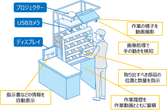 プロジェクターで部品の取り出しを明確に指示、作業指示書や動画を投影