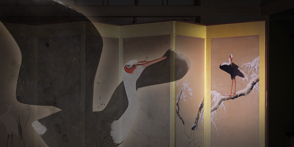 「十二ヶ月花鳥図」の高精細複製品に、季節の花や鳥を映像と音で表現するプロジェクションマッピングを実施。屏風に描かれた1月から12月までの自然の移ろいを、音と映像で追体験できる鑑賞体験。