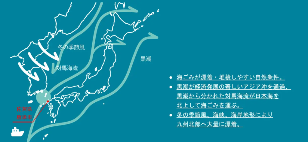 佐賀県の波戸岬は、好漁業場であるとともに、玄海国定公園に指定されており、観光地としても県内外からたくさんの来訪者がある一方で、海流や地形、季節風などの自然条件から、大量の海洋ごみが日々漂着している。