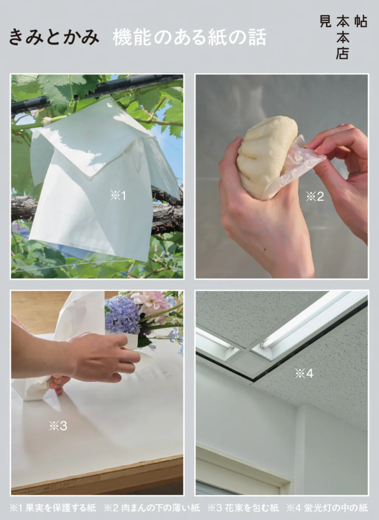 紙には、さまざまな環境や特殊な用途に対応するため、機能性を付与した「機能紙」と呼ばれる分類がある。機能紙は、日常のいたるところにひそんでいる。果実を保護する袋は撥水性のある紙、蛍光灯の中には電気を通さない絶縁性のある紙、あるいは肉まんにも剥離性・耐熱性のある紙が使われている。同展は、日常生活にひそむ「機能紙」を写真と小説でえがいた展示企画である。