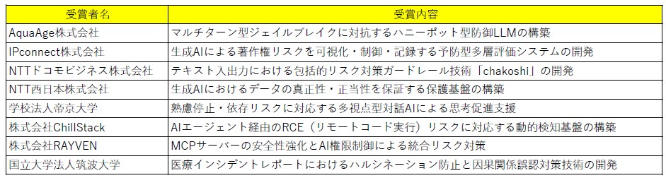 経済産業省とNEDO(新エネルギー・産業技術総合開発機構)は、NEDO懸賞金活用型プログラム「GENIAC-PRIZE」の3領域の1つである「生成AIの安全性確保に向けたリスク探索及びリスク低減技術の開発」においてトライアル審査を行い、2025年10月9日、67件の応募の中から8件の受賞者を決定した。