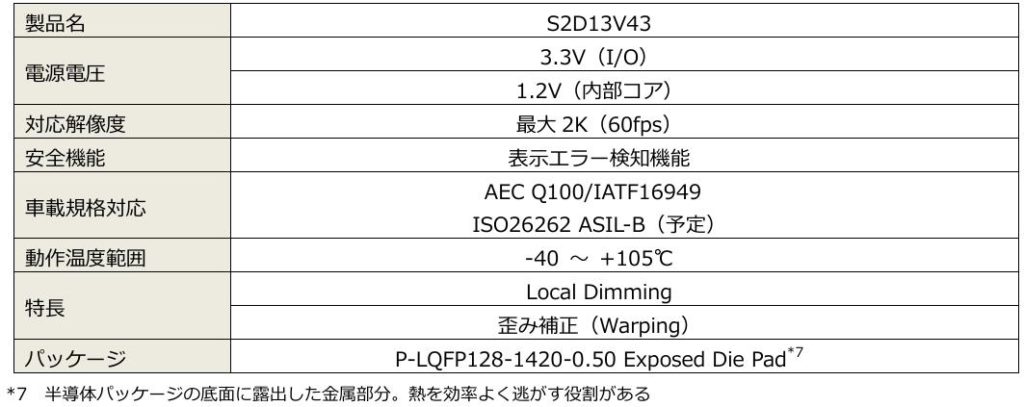 同製品は、Host(SoC*3)からストリーミングされる2Kの映像データに対応し、外付けメモリなしで自動車のフロントガラス曲面に合わせた歪み補正を行う。また、Local Dimmingにより、映像を解析し、表示内容に合わせたバックライト制御が可能で、HUDやその他の車載ディスプレイにおける映像の視認性向上や低消費電力化に貢献する。