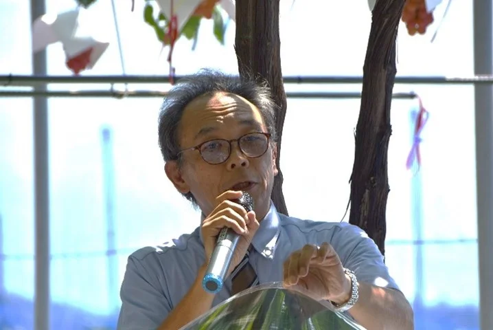 今回の実証は「発電」と「農業栽培」の両立を目的として「サンシャインレッド」の栽培を行った。従来の「ソーラーシェアリング」とは異なり、「ソーラーマッチング」という独自の概念を採用している。有機薄膜太陽電池は、色の選択性と再現性に優れており、軽量で光を透過できることが特徴だ。ペロブスカイト太陽電池と混同されることがあるが、この技術は有機物を使用し、鉛やスズを含まないため安全性が高い。果樹での実証は初の試みであり、少し心配もあったが今日の様子を見る限り、うまくいったようで安心している。有機薄膜太陽電池は農業分野で非常に期待が高い技術で、山梨県とタッグを組んで、取り組んでいきたい。