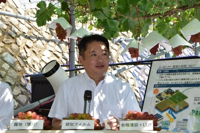 山梨県は2025年8月27日に、同年7月22日より開始した世界初となる「有機薄膜太陽電池をブドウ棚で活用した、県オリジナル品種『サンシャインレッド』の着色を向上させる実証実験」の現地説明会を開催した。