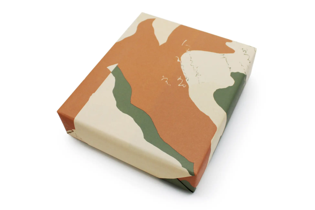 叶 匠壽庵では創業当初より、やわらかな風合いのあるオリジナルの包装紙を使い続けてきた。琵琶湖とそれを取り囲む地をモチーフにしたデザインに、近江が舞台となる額田王と大海人皇子の万葉歌が添えられている。故郷・滋賀をあらわしている従来のデザインはそのままに、「竹紙」と「植物油インキ」を使用した包装紙に変更する。従来の包装紙が無くなり次第順次新包装紙へと切り替える。また、包装紙変更に伴い、紐かけ等の包装形態も変更を予定している。