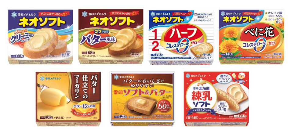「ネオソフト ハーフ」「ネオソフト べに花」(各 140g)「バター仕立てのマーガリン」(130g)