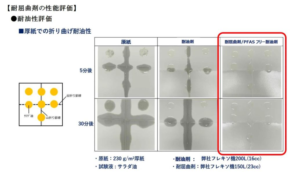 また今回、耐屈曲剤と同時に新製品として上市するPFASフリー耐油剤は、人体や環境への影響が懸念され、大きな問題となっているPFAS(有機フッ素化合物)を使用しておらず、改正食品衛生法ポジティブリスト(PL)に収載された物質のみを使用している。