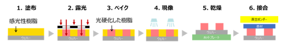 同開発品は、フォトリソグラフィー工程を用いた微細パターン形成と接合を一体で設計可能な感光性材料であり、MEMS製品の中空構造形成工程3)における接合材としての適用を想定している。4)かつNMPフリー5)
