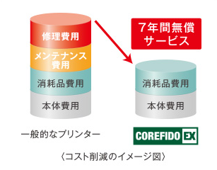 プリンターの導入にあたっては、本体価格だけでなく、修理費や定期交換部品などの維持費用も含めた総合的なコスト判断が求められる。COREFIDOは、最長7年間の「長期無償保証」と「メンテナンス品長期無償提供」により、こうした運用コストの削減に大きく貢献する。