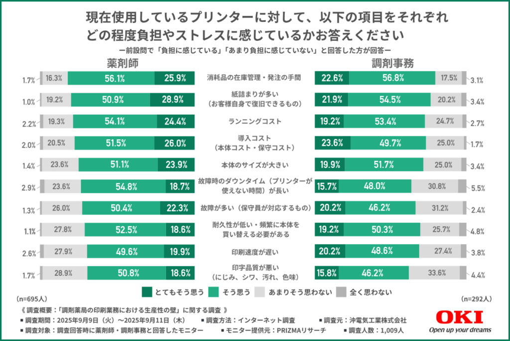 調剤薬局では、限られた時間の中で大量の薬袋や薬剤情報提供書、領収書を正確に出力することが求められている。しかし、印刷にかかる時間や紙詰まり、消耗品切れ、用紙切れなど、日常的に発生する小さなトラブルが積み重なることが、現場の効率を左右しているのではないか。では、実際に調剤薬局では印刷業務をどの程度の負担と感じているのか。また、プリンターの故障やトラブルは、どの程度業務に影響を及ぼしているのか。そこで今回、OKIは、薬剤師・調剤事務を対象に、「調剤薬局の印刷業務における生産性の壁」に関する調査を実施した。