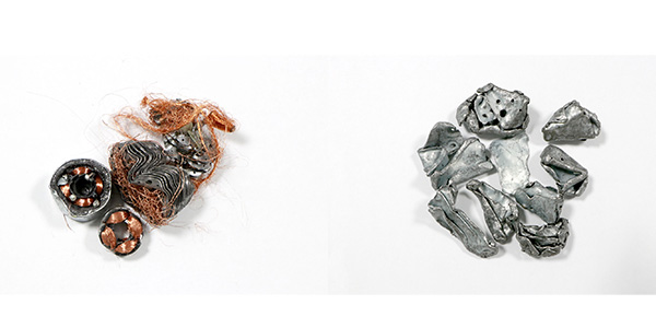 (左:銅が付いた状態の鉄、右:純度99%に分別した鉄)