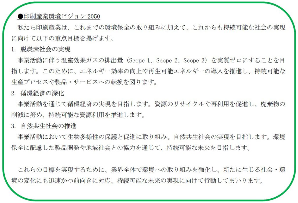 本ビジョンの達成には現状の省エネ活動、再生可能エネルギーの導入、最新技術の応用や効率的な資源循環や持続可能な原材料調達、今後の革新的な技術導入や他の産業、業界や地域社会との連携が必須であります。印刷産業のみならず、様々な関係者からご支援を賜りたくお願いする次第です。