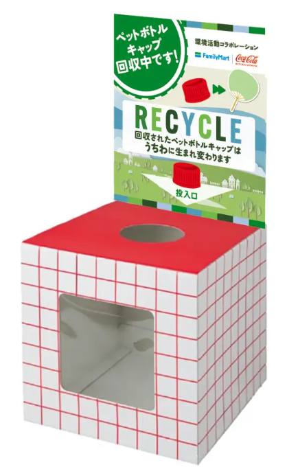 ファミリーマートとコカ・コーラ ボトラーズジャパンは、東京都足立区内のファミリーマートの一部店舗(20店舗)で回収したPETボトルキャップを活用し、リサイクル素材を用いた「オリジナルうちわ」を制作する取り組みを開始する。2026年2月下旬より順次、店内に回収ボックスを設置し、制作したうちわは回収を実施した20店舗で配布する。