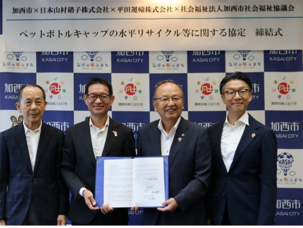 日本山村硝子は、兵庫県加西市・平田運輸・社会福祉法人加西市社会福祉協議会の3者と、加西市域において排出される使用済みのペットボトルキャップを、新しいペットボトルのキャップとして再生する「水平リサイクル(Cap to Cap)」の推進を目的とした協定を2025年8月25日(月)に締結した。