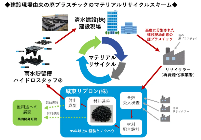 城東リプロンは、清水建設 と協業し、日本道路と伊藤忠プラスチックスの協力を得て、清水建設の建設現場で回収した廃プラスチックをプラスチック製雨水貯留槽(ハイドロスタッフ)の構造体にマテリアルリサイクルし、清水建設の建設現場に戻す取り組みを開始した。