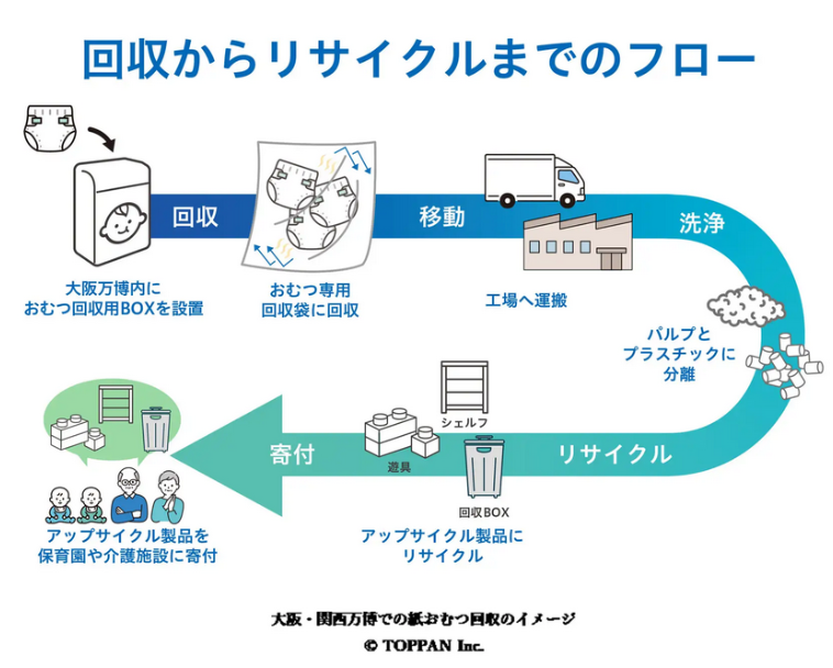 おむつ回収ボックスは、TOPPANが2025年日本国際博覧会(大阪・関西万博)において会場内の休憩所やトイレ等の11カ所(予定)に設置し、リサイクル実証実験を行う。