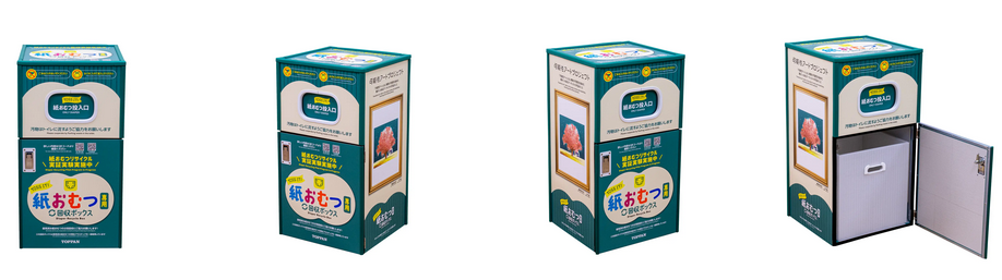 TOPPANが、回収された使用済み紙おむつをリサイクル工場においてパルプとプラスチックに分離し、このプラスチックのリサイクル材を岐阜プラスチック工業の軽量・高強度素材である樹脂製ハニカムパネル「テクセル」に配合。さらに「おむつ回収ボックス」として加工、製品化した。