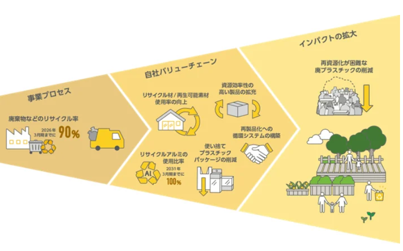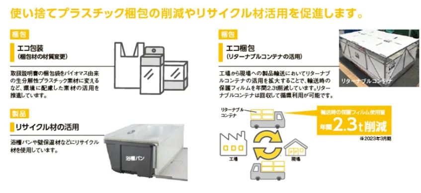 LIXILは、環境ビジョン2050「Zero Carbon and Circular Living(CO₂ゼロと循環型の暮らし)」を掲げ、2050年までに事業プロセスと製品・サービスによるCO₂排出量を実質ゼロにすることを目指している。そして、この環境戦略の実現に向けた3つの重点領域の1つを「資源の循環利用を促進」とし、浴室事業においても、「事業プロセス」「自社バリューチェーン」「インパクトの拡大」の全フェーズを通じた包括的な戦略アプローチおよび中期目標を定めて、取組を進めている。