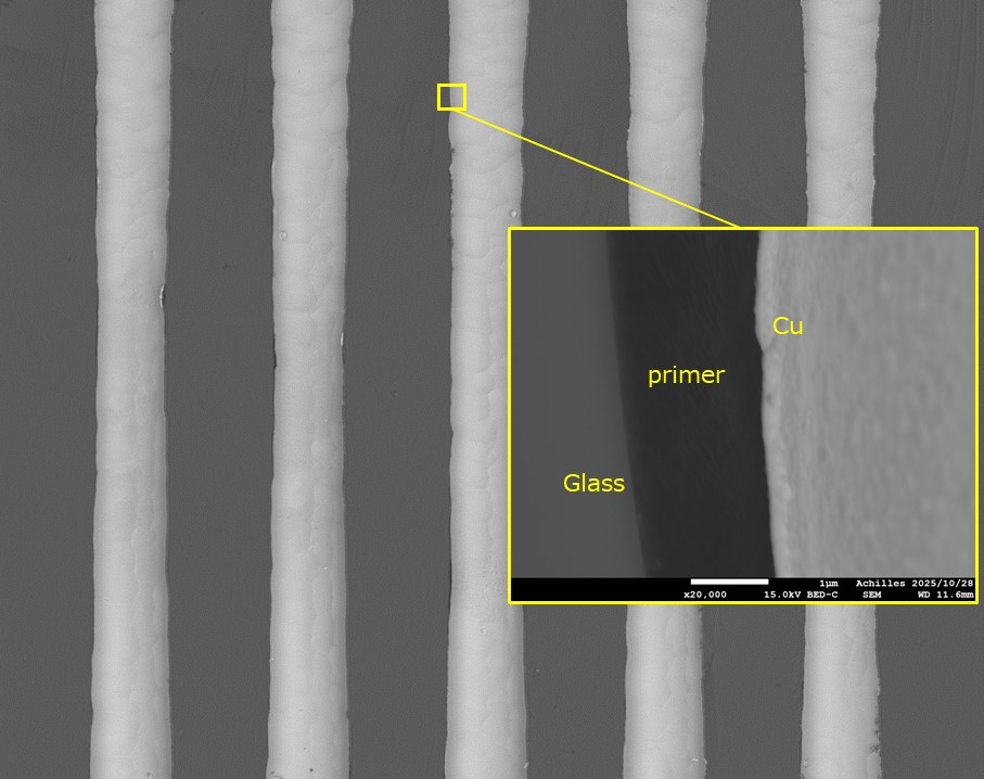 同社は導電性高分子であるポリピロールを用いた独自のめっき技術を開発し、様々な難めっき素材に対応する密着性の高いめっき技術を提供してきた。2024年には、それまで難易度が高いとされていたガラス基板への高密着めっき膜形成技術を開発。一般にガラス基板へのめっきで高密着性を得るには300℃以上の高温処理が必要とされているが、ポリピロールめっき法は低温・常圧のプロセスで密着性の高いめっき膜をガラス基板に形成できることが特長。