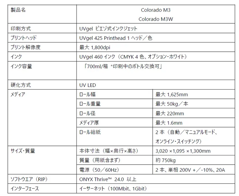 “Colorado M3/M3W”は、主にサイン&ディスプレイ市場や建装材市場を対象に、UVgel(ユーブイジェル)テクノロジーを搭載した64インチ対応UV硬化型大判プリンター。同製品は、2023年8月に発売された、高生産性・高品質を実現する「Colorado M5/M5W」のエントリーモデル。印刷速度と初期投資コストを抑えながら、ミッド・ローボリュームの印刷ニーズに対応することで、Colorado Mシリーズのラインアップ強化を図っている。